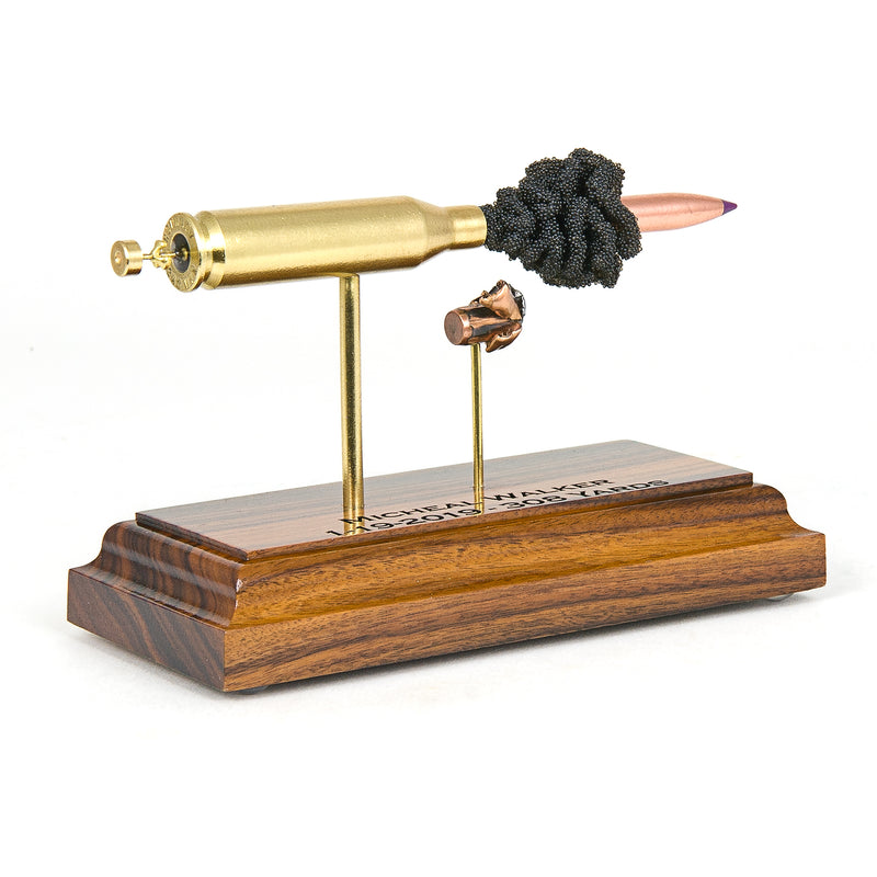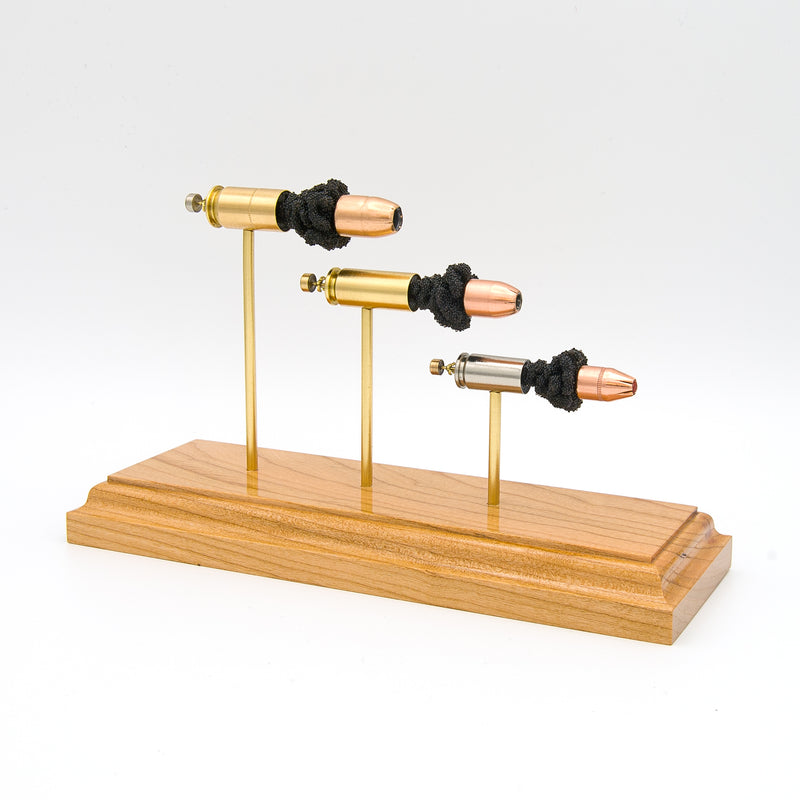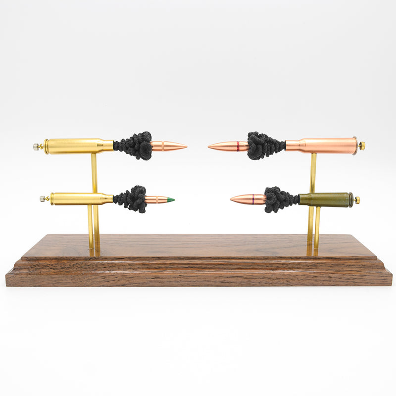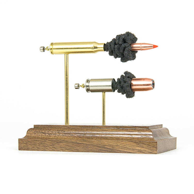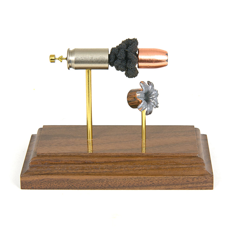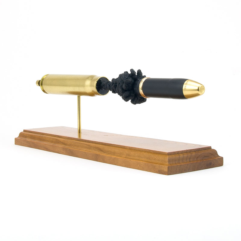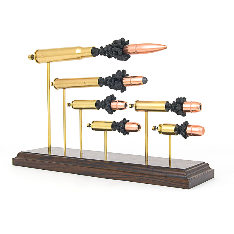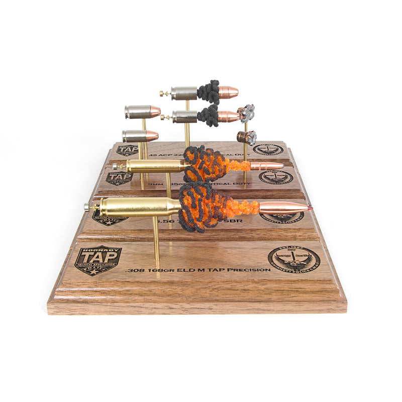 Standard displays include a neutral black powder cluster. Alternative powder styles such as spiral formations or colored FirePowder configurations are available and can be done to nearly any caliber.