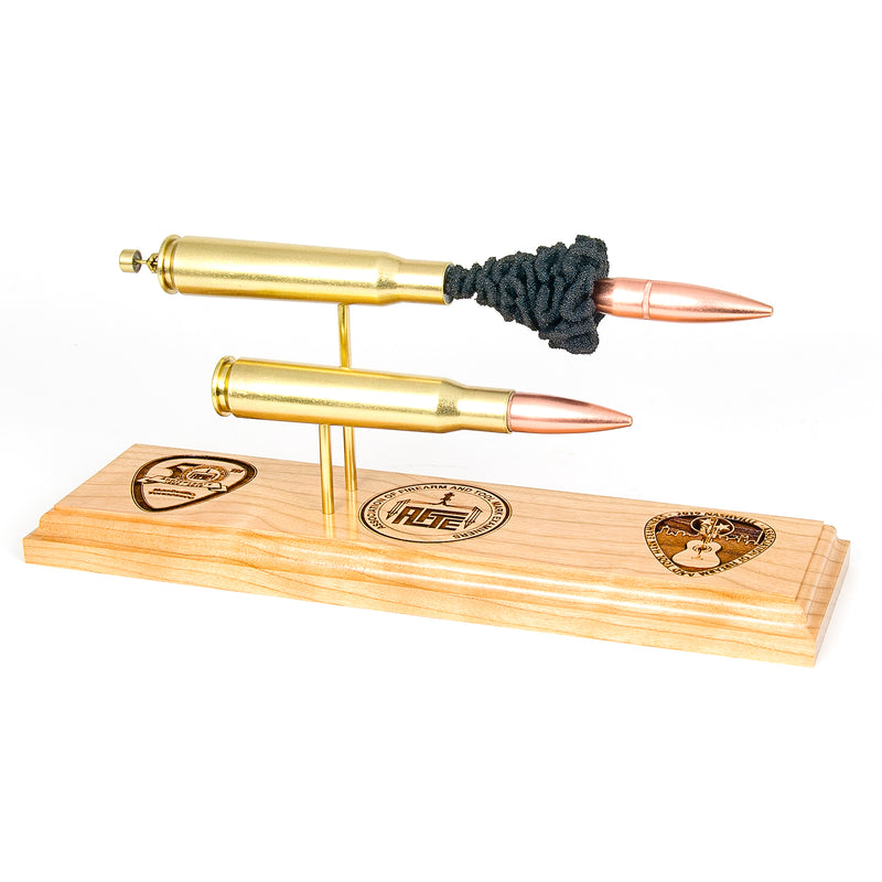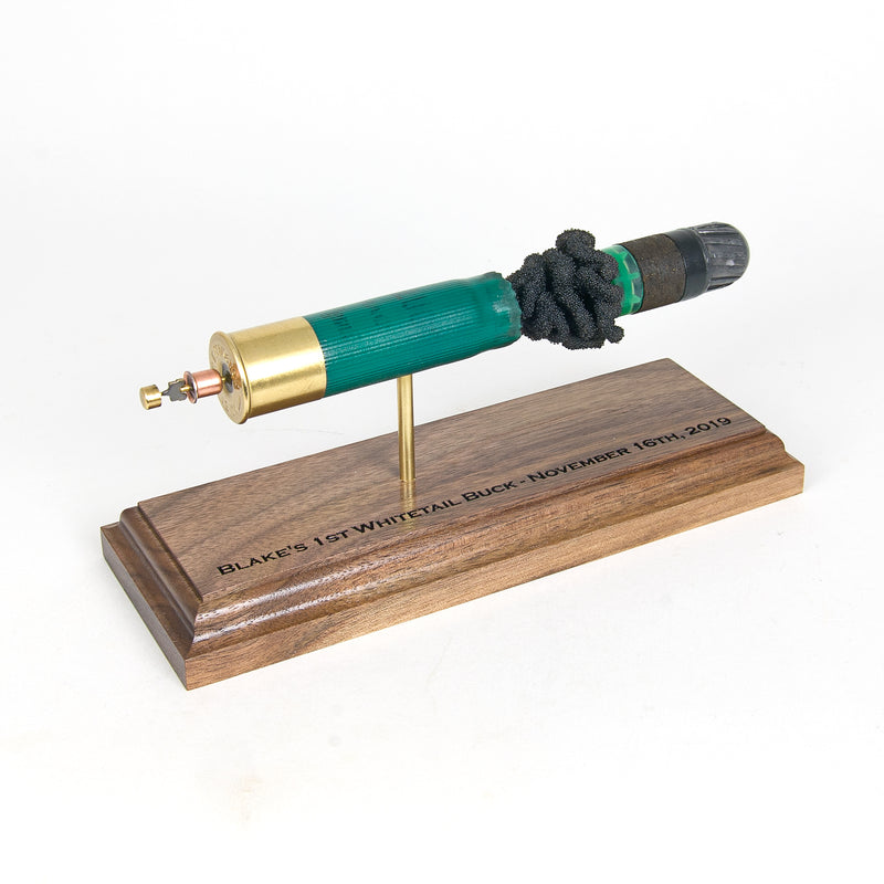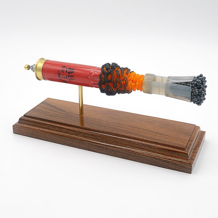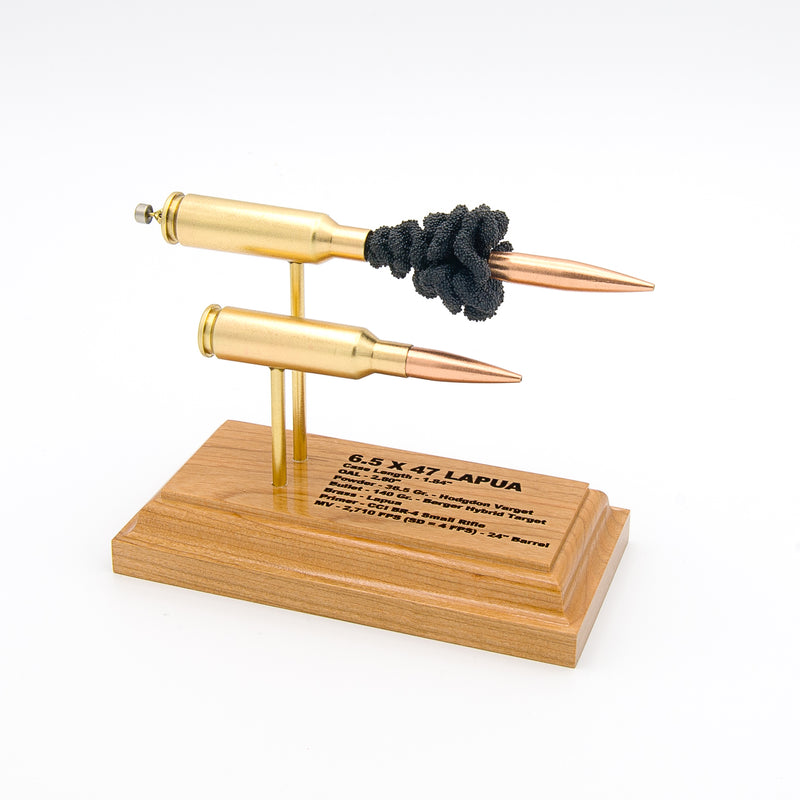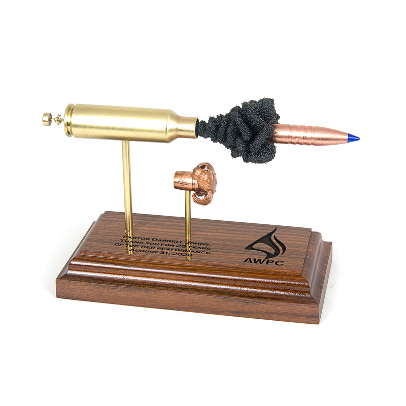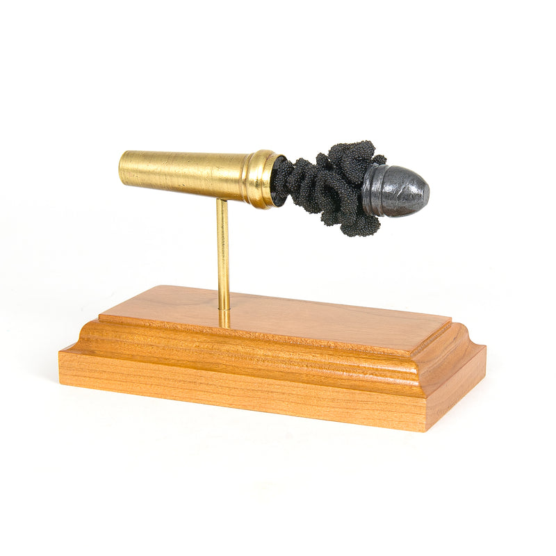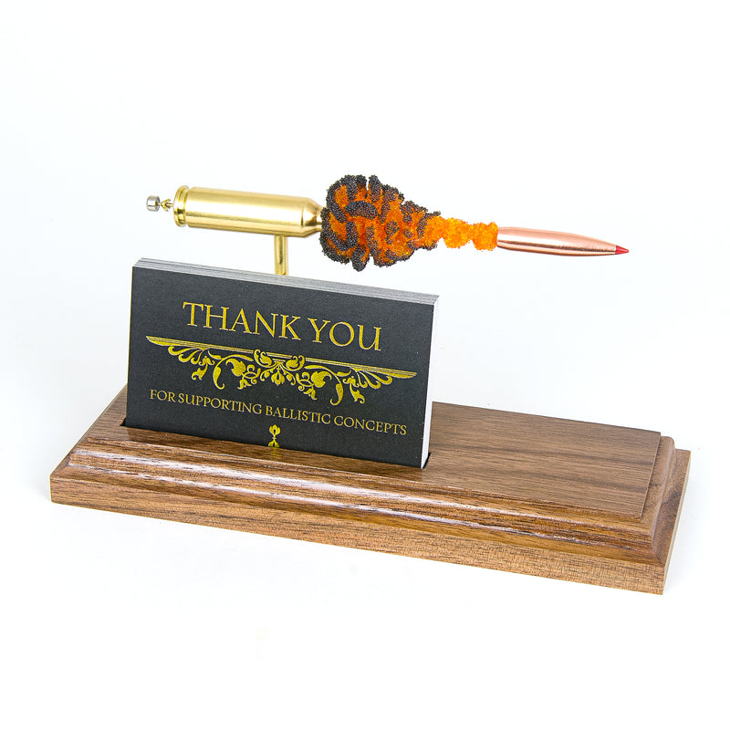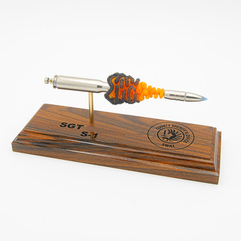 Standard displays include a neutral black powder cluster. Alternative powder styles such as spiral formations or colored FirePowder configurations are available and can be done to nearly any caliber.